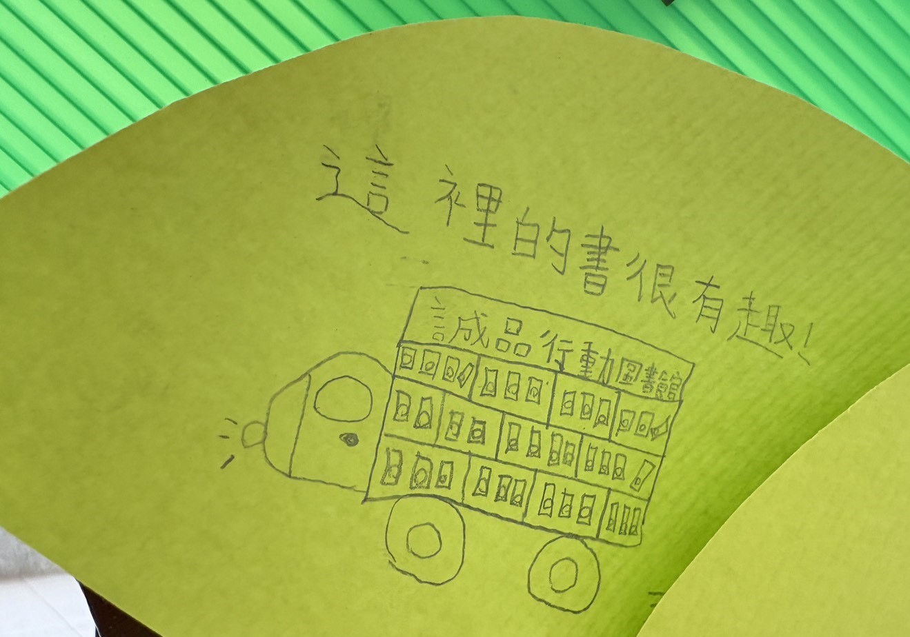 有人畫了七彩彩虹,有人畫出城堡與愛心氣球,還有人在葉片上寫著歪歪斜斜的字:「謝謝書車來,我好喜歡看書!」雖然字跡稚嫩,卻比任何句子都更真摯。