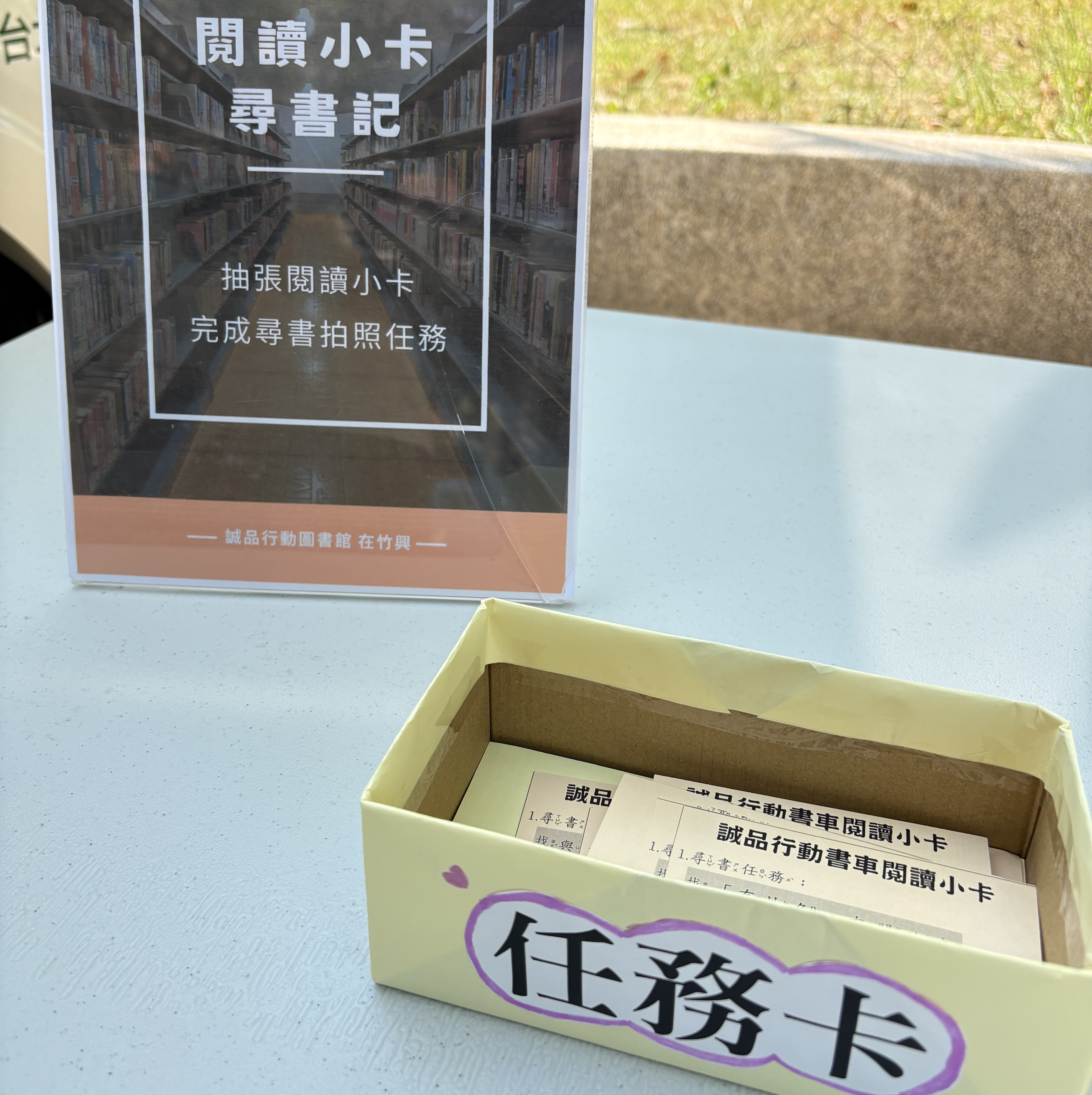 為了讓孩子更有方向的探索,老師特別設計了「行動圖書館閱讀任務小卡」,每張小卡上印有關鍵字——「心情」、「藍色」、「地球」、「糧食」等,引導學生以主題為線索尋書。
