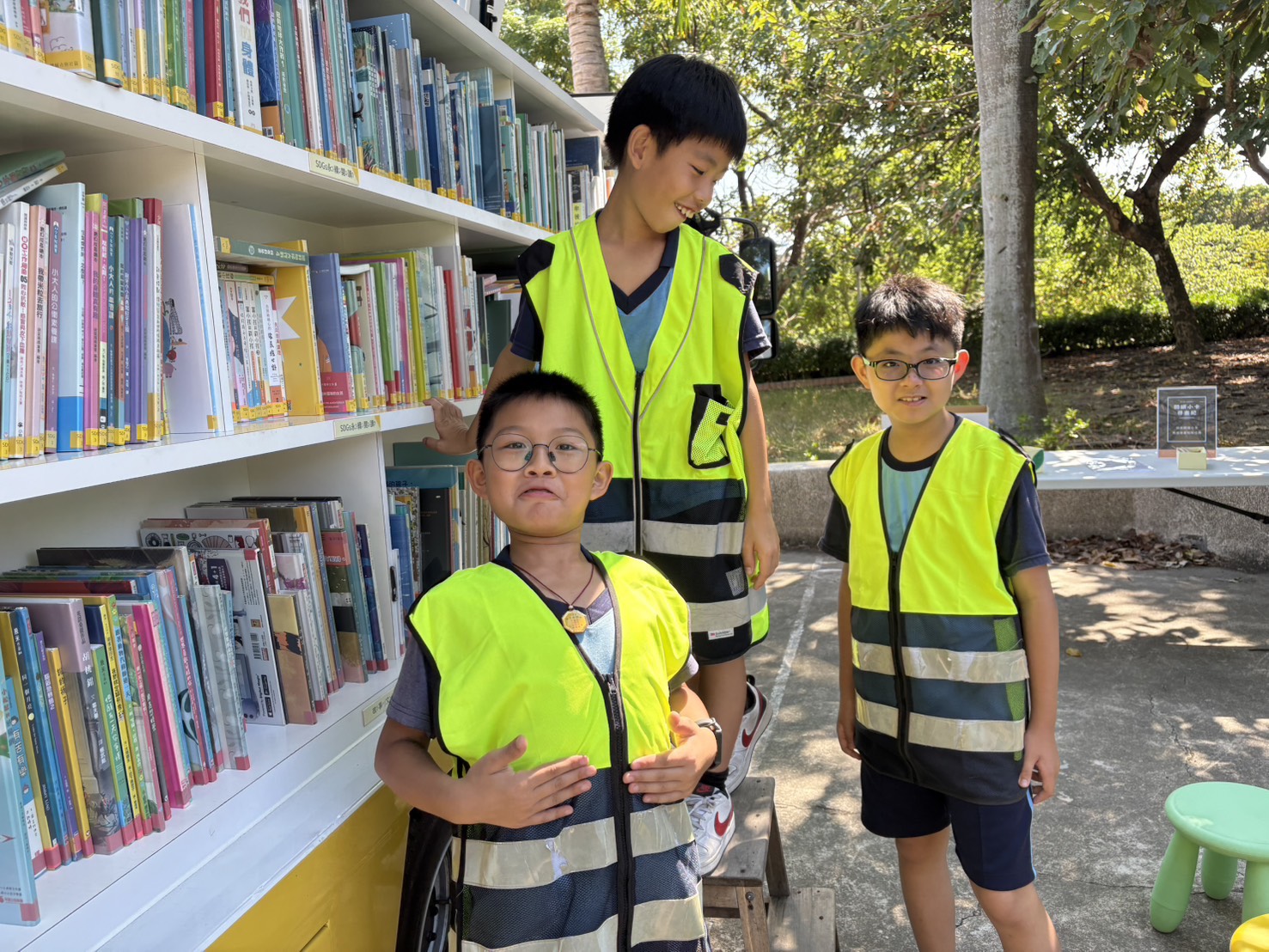 孩子們圍上前,好奇的摸著書架、指著書名,老師提醒著:「等等有特別的小任務喔!」笑聲、腳步聲、翻書聲在校園間此起彼落,這一天,閱讀不在教室裡,而在陽光下、樹蔭間發生。