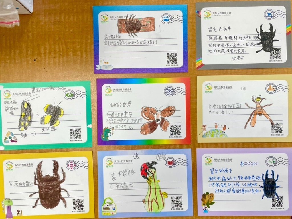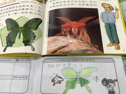 透過老師的分享我們得以窺見,有位小女孩閱讀《蛾的世界》後,開始主動觀察昆蟲的形態,並以卡片細緻描繪翅膀紋理與觸角結構;另一位孩子因鍬形蟲的介紹深受吸引,一邊閱讀、一邊探索外型特徵,首次將所學知識轉化為自己的創作。這些由閱讀延伸出的作品,在班級分享時引發熱烈討論,使教室真正成為探索、理解與創造的學習場域。