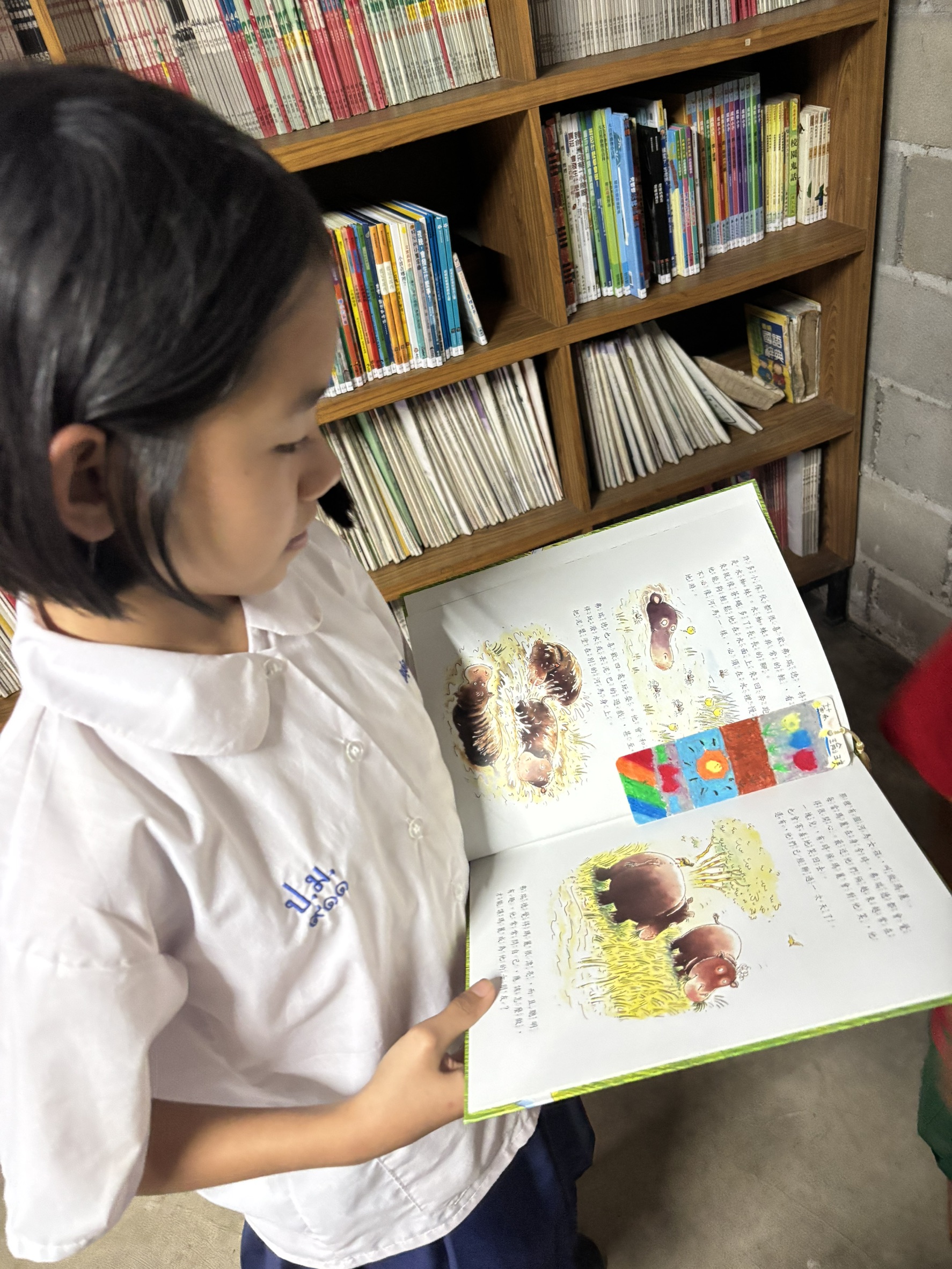 在服務過程中,我們特別設計了「書籤工作坊」來連結書籍與孩子的生活,孩子們在空白書籤上,可以設計出屬於自己的特色書籤 。而我們希望學生可以藉由書籤跟書籍有更多的連結,在過去的時間當中,原先空蕩蕩的教室堆疊著許多不符學齡的舊書,學生幾乎沒有主動翻閱課外書的習慣 。然而,隨著符合他們年齡、內容吸引人的書籍入駐,原本放學後無人問津的空間,開始出現學生主動駐足的身影,學生們甚至在下課時間成群結隊跑進圖書室,只為了繼續閱讀尚未讀完的書籍 。而這份成果正是因為誠品文化藝術基金會的贈書,才使我們能在泰北完成最主要的任務,也因為誠品文化藝術基金會的支持,讓這份書香實質轉化為孩子們指尖下的希望,陪伴他們在資源不足的環境中,依然能看見更廣闊的世界 。