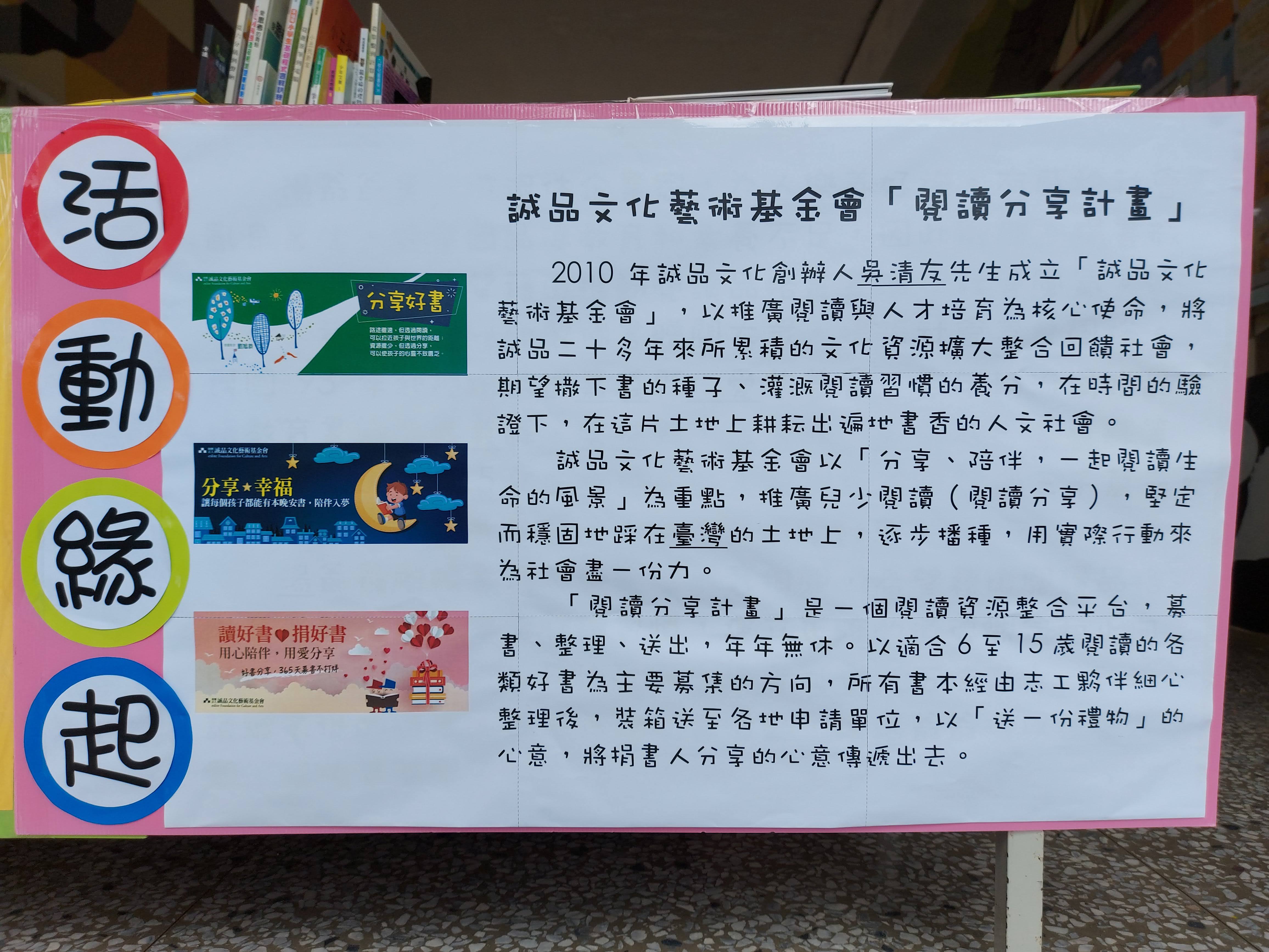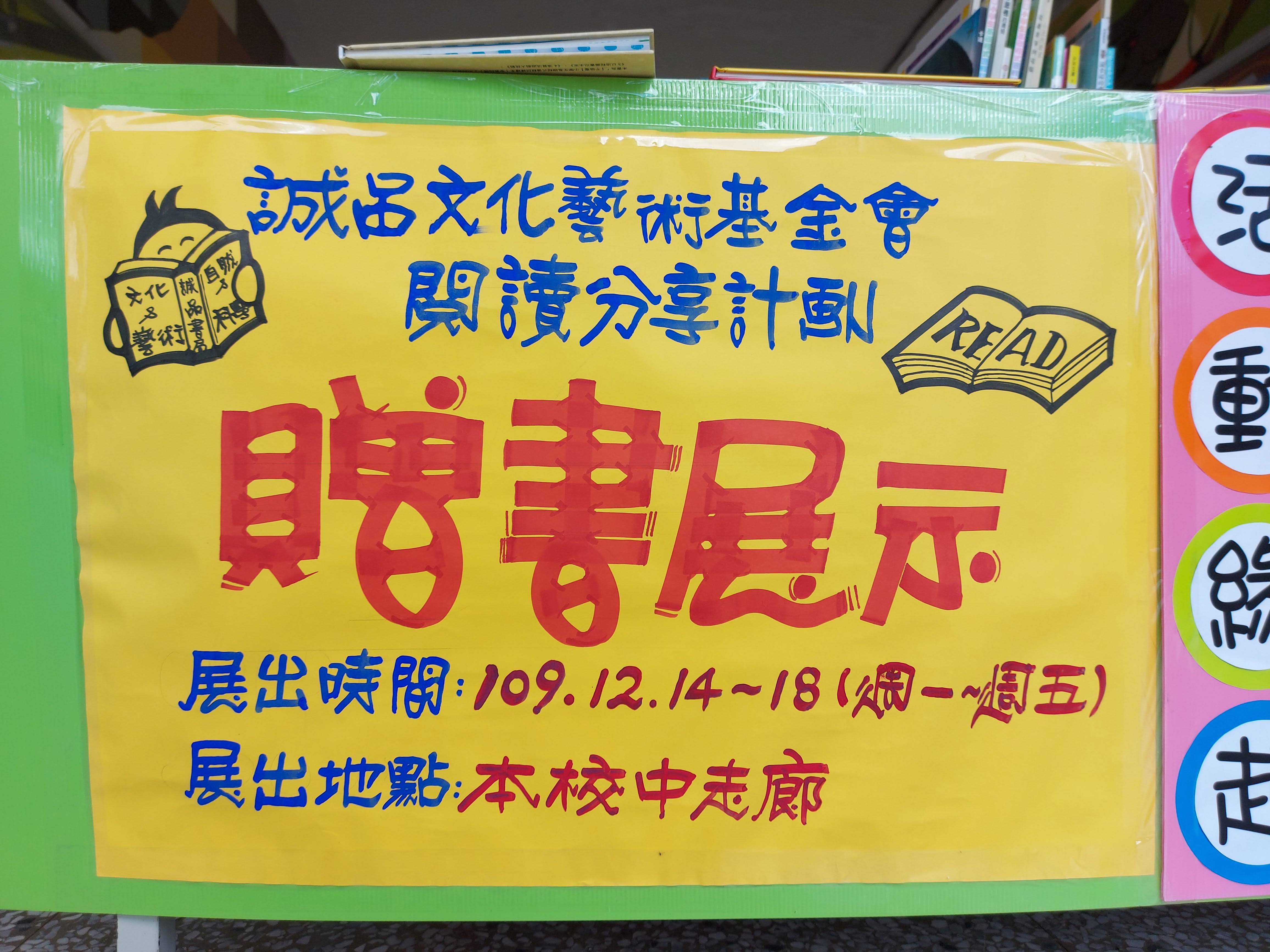 三、109年12月14~18日期間,於本校中走廊辦理「誠品文化藝術基金會閱讀分享計畫」贈書展示活動。為活化書籍流通利用及分享閱讀資源,12月22日起將271本贈書放置圖書室新書展示架、教師用書區,方便師生借閱使用,並結合本校閱讀學習護照認證活動,鼓勵學生踴躍借閱,激發閱讀興趣和意願。