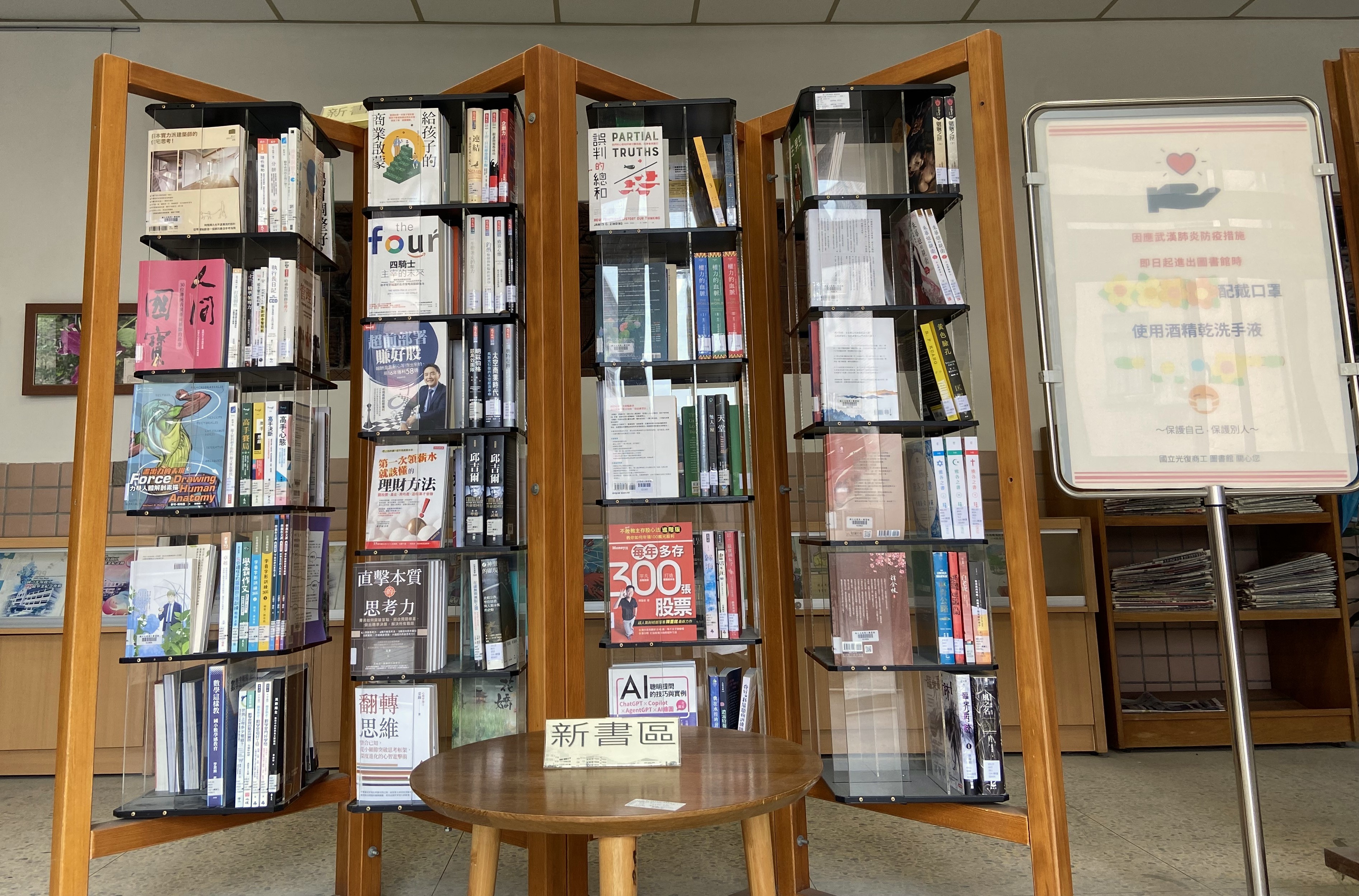 本校收到誠品基金會捐贈書籍後,隨即將書籍展示於圖書館大廳入口處的旋轉書櫃,並設置「新書區」立牌,藉由擺在明顯的陳列位置吸引師生於進出圖書館時駐足翻閱,提升新書的能見度與借閱量。