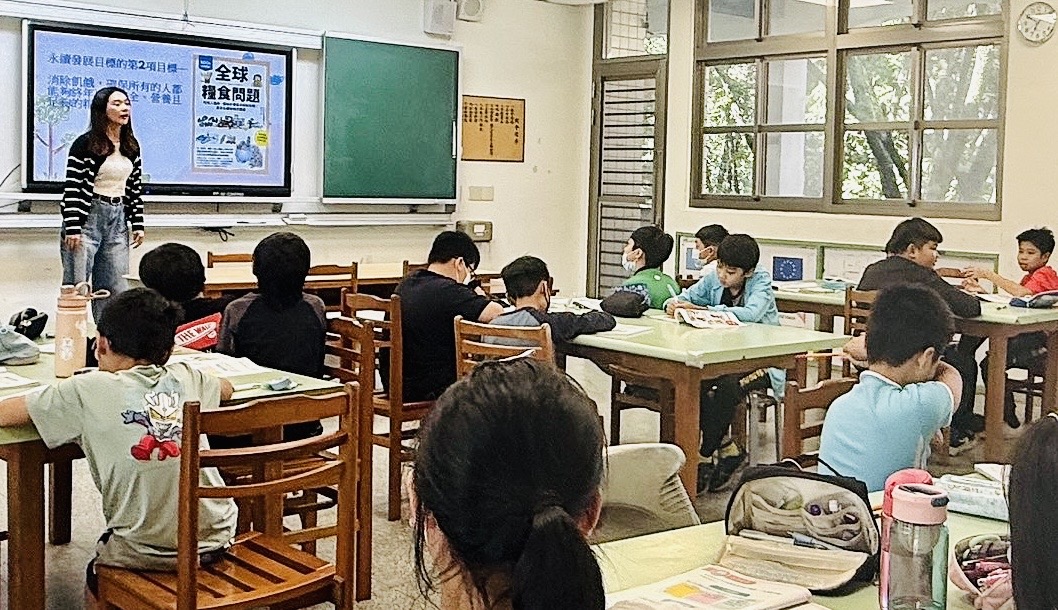 學校也將這些書籍延伸至班級閱讀推動與校園展覽中。每班挑選一項SDGs主題,結合閱讀、繪圖與短文創作,製作「我的永續小書」。高年級學生則運用平板,以簡報方式發表行動提案,例如:「如何讓校園午餐更永續?」、「我們能做什麼減少剩食?」等,展現跨領域統整學習的成果。